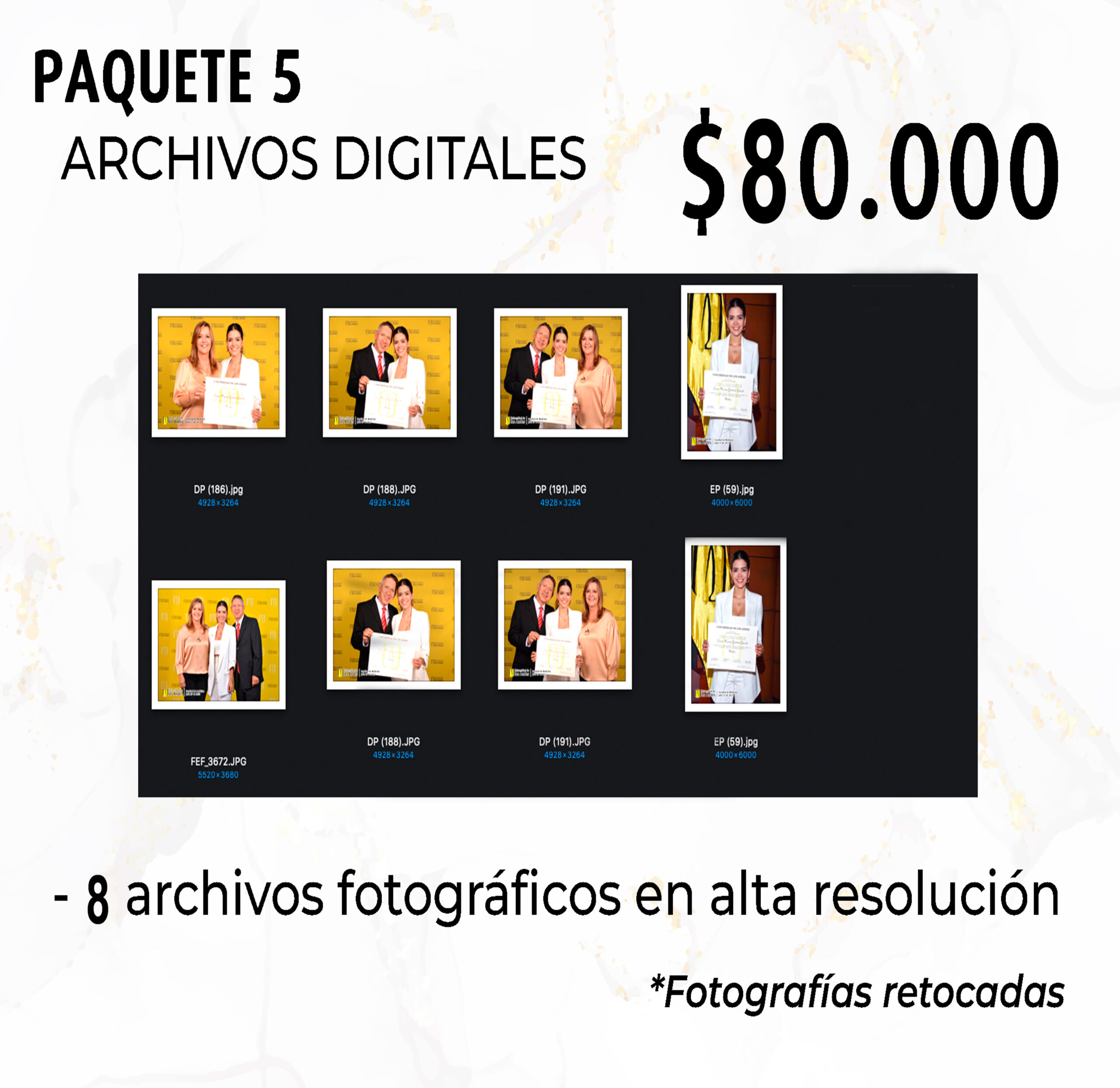 Las fotos digitales se podrán imprimir y compartir libremente. Cuéntanos cuáles quieres para enviarlas en alta resolución al correo electrónico. El precio por archivo adicional es de $10.000.