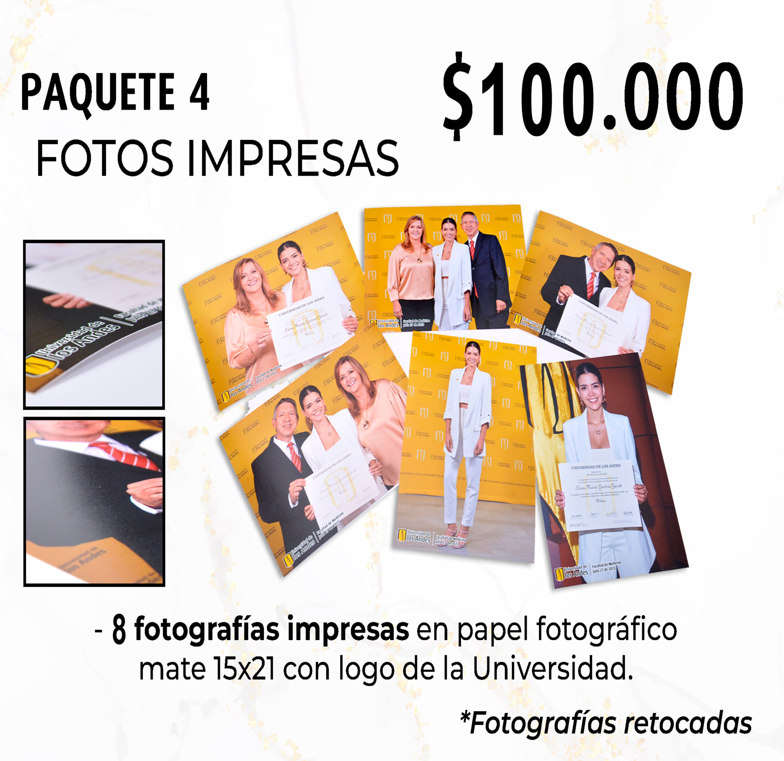 Las 8 Fotografías impresas serán en tamaño 15 x 21 centímetros. Serán enviadas 8 días después de acusar recibo de las fotos que hayan elegido. El precio por foto adicional es $10.000 en el mismo tamaño.